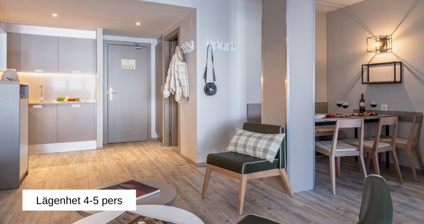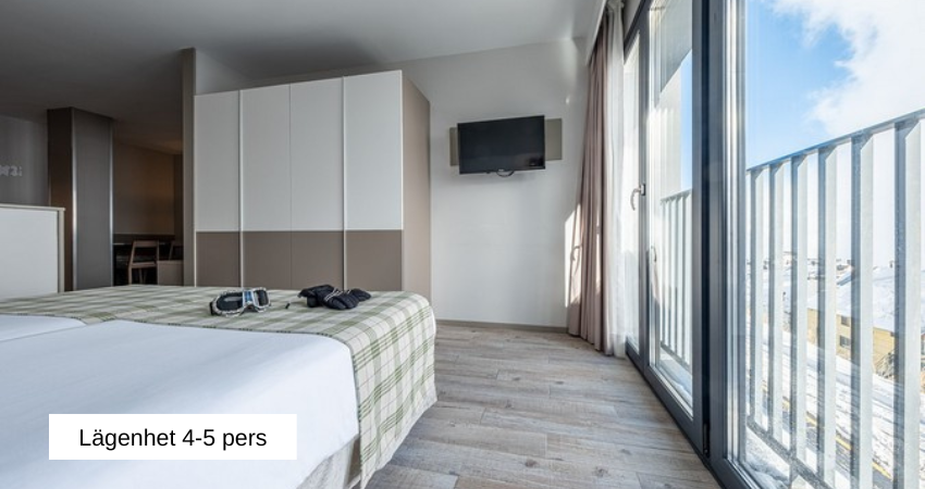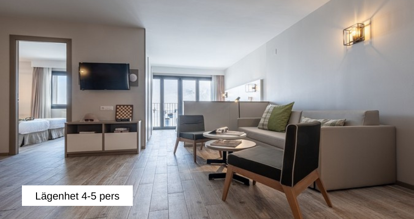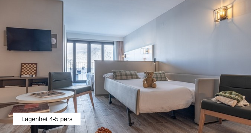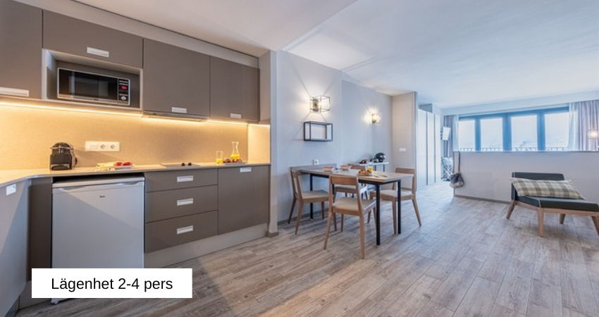 - Lägenhet med 1 sovrum (2 sängar) och två enkelsängar + bäddsoffa i vardagsrummet (4-5 personer)