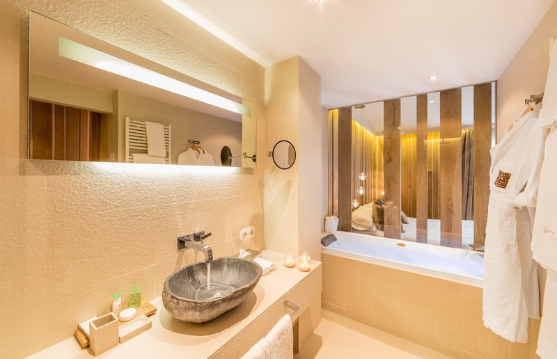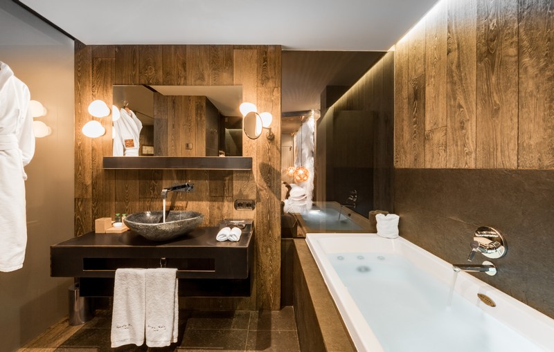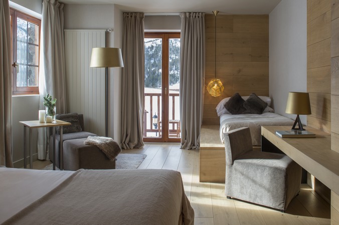 Superior family room: 36-40m². Dessa rum passar till familjer om 2 vuxna och 2 barn (max 11 år). Rummen har en balkong, en king size säng och en bäddsoffa. I badrummen finns ett jacuzzi badkar och separat duschkabin. Dessa rum har en avant-garde bergsdesign och inredning i ek, läder och andra högkvalitativa material. 2-4 personer.
