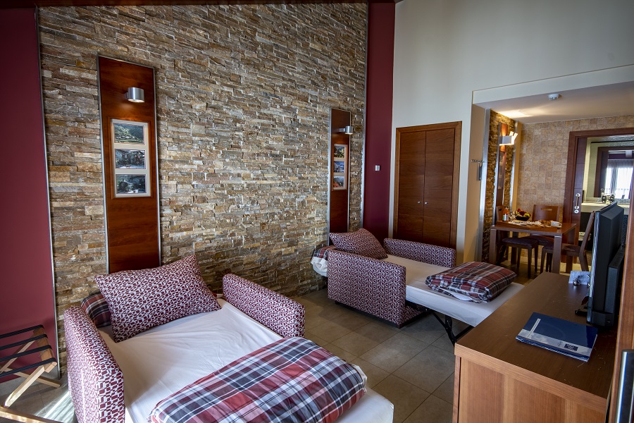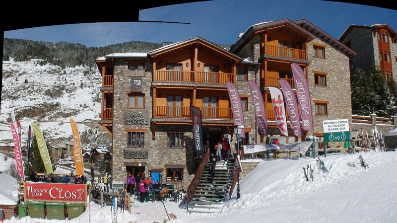Lägenheterna är inredda i typisk Andorransk stil med mycket trä och sten. Hotellet ligger alldeles vid backen så det är bara att ta på pjäxorna och glida ner till liften.